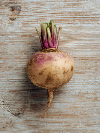 A vibrant, unpeeled rutabaga showcases deep purple-stemmed foliage, resting on weathered wooden planks, evoking fresh, wholesome ingredients for nourishing dishes.