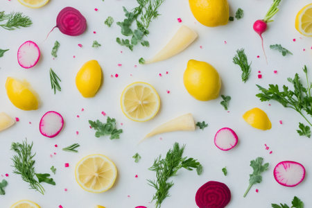 Lemons, radishes, and herbs are beautifully displayed on a white backdrop, showcasing their vibrant colors and textures.