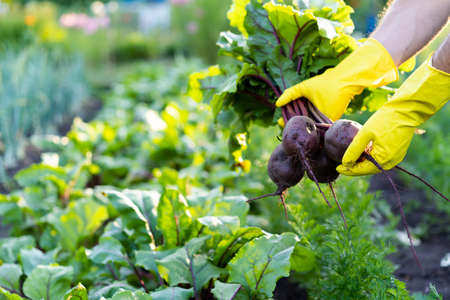 beet harvest in the hands of the farmer, gardening and agriculture, environmentally friendly products dug out of the garden