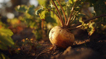 A closeup shot of a growing turnip with green leaves planted in a farm