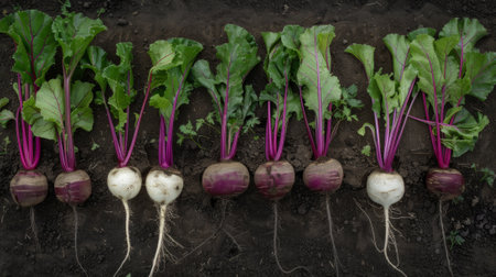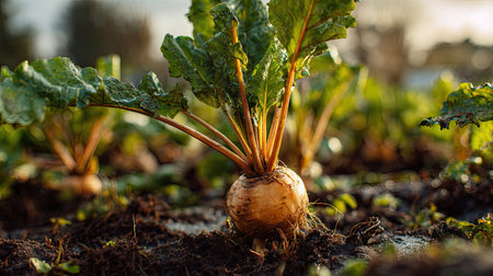 A close-up of a beetroot plant growing in healthy soil, surrounded by other vibrant root vegetables.