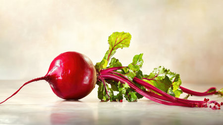 A beautiful red radish with green leafy tops resting on a smooth surface, perfect for culinary presentations, gardening themes, and healthy eating promotions.