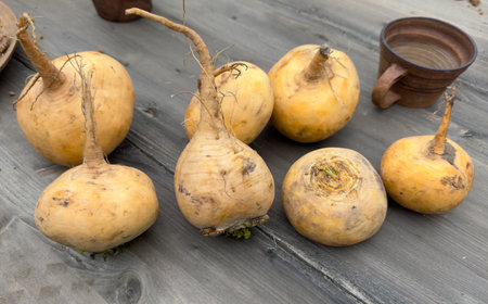 Rutabaga or swede root vegetable atop grey concrete backdrop, top view