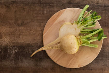 Sliced white turnip with tops lies on a round cutting board. A healthy root vegetable grown in the garden. Horizontal orientation