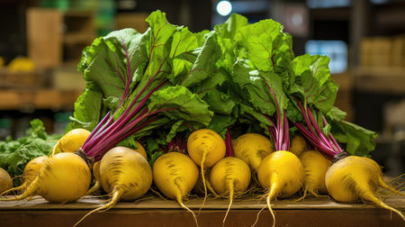 Beets is arranged in supermarket produce section, showcasing their rich colors and inviting shoppers for selection. Seasonal vegetable offers freshness and quality. Generative AI.