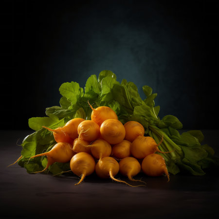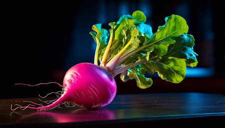 An AI generated illustration of a vibrant, freshly-picked beetroot on a dark black background
