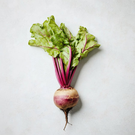 A single beet with its leafy top, isolated on a white background, highlighting a nutrient-rich vegetable