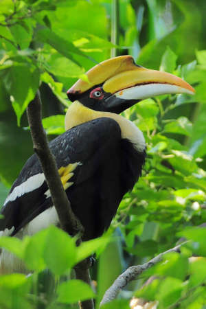 Closeup Great Hornbill with Green Leaves Foreground