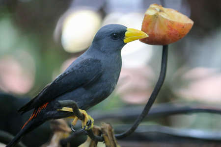 The Javan myna (Acridotheres javanicus), also known as the white-vented myna or Jalak Kebo in a branch with eating apple.