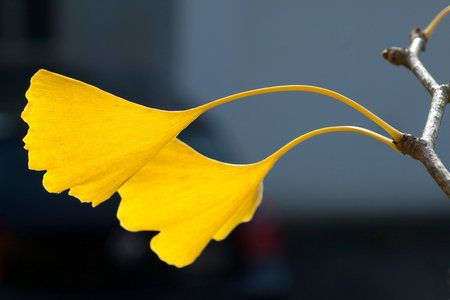 Yellow leaves of kinkgo biloba on a dark background. autumn backgrounds. Aging themes. alternative medicine.