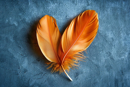 Two vibrant orange feathers arranged in a heart shape against a blue textured backdrop