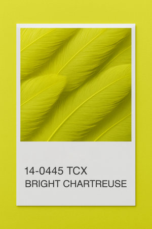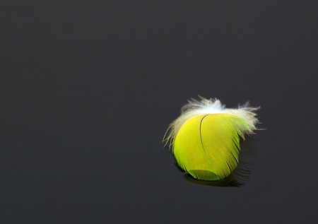A vibrant feather in shades of yellow, blue, and green rests on a reflective surface.