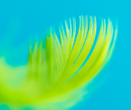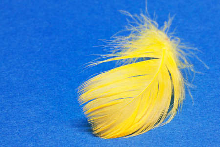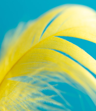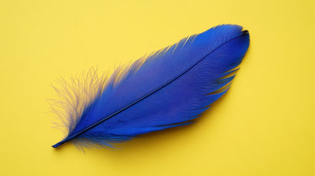 A stunning blue feather resting on a vivid yellow background, showcasing its delicate texture and vibrant color, ideal for nature and art projects.