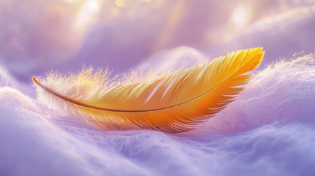 A stunning close-up of a delicate orange feather resting on a soft, abstract pastel background. The gentle lighting creates a serene and dreamy atmosphere, showcasing the intricate details and textures of the feather, perfect for conveying themes of tranquility and beauty.