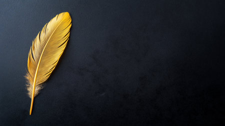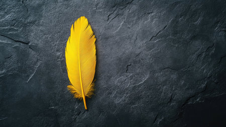 A striking yellow feather rests on a dark slate background, creating a vibrant contrast. This image captures natural beauty and elegance, perfect for artistic projects.