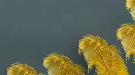 Yellow ostrich feathers on gray background. Chinese new year concept. Trendy color 2021. Creative copy space.