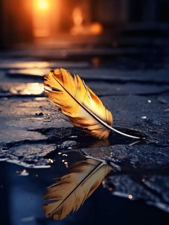 A golden feather rests on a dark wet surface, its reflection mirrored perfectly in a puddle. Sunset light illuminates the scene.