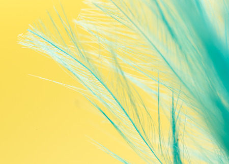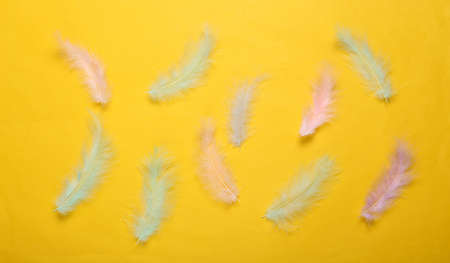 Soft colored feathers on yellow background. minimalism. top view. flat lay