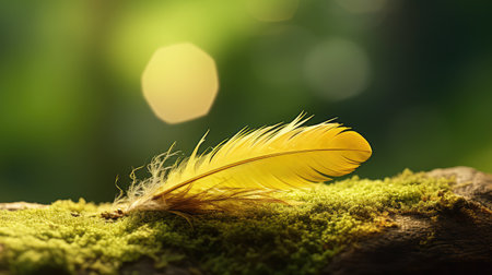 A striking bright yellow feather rests on a textured surface, showcasing its vibrant color and intricate details. Ideal for creative projects.