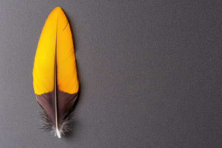 A striking yellow feather rests gracefully on a textured gray background. This image captures the essence of beauty and simplicity, perfect for artistic projects.
