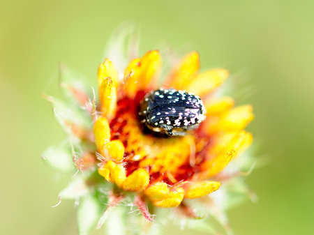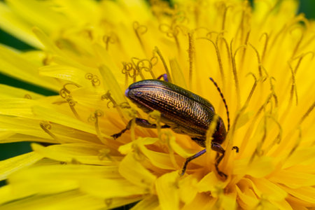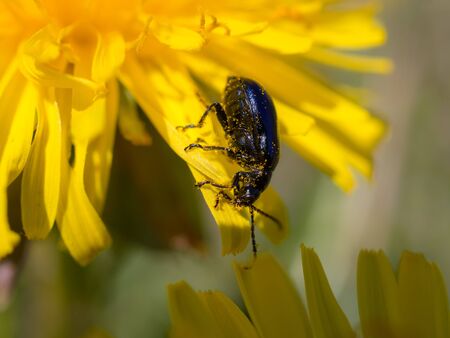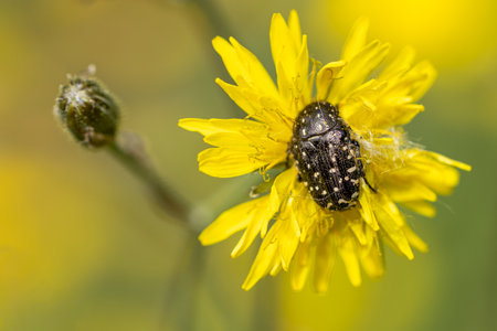 beetle Tropinota hirta eats pollen from a yellow dandelion flower
