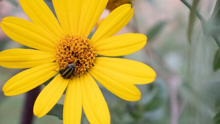 June bug , the cockchafer,is a large yellow Daisy. Insect life, spring background, copy space for text.