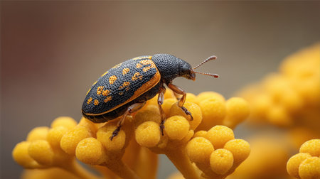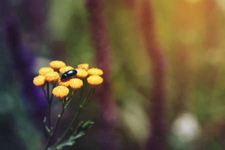Beetle sitting on yellow wildflowers. Summer sunny day.