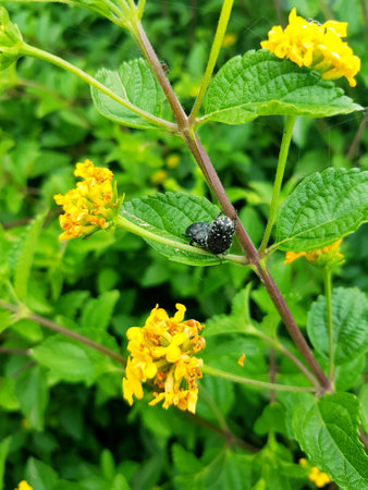 Large black beetle insect in yellow tropical flowers in Mai Khao Thalang District on Phuket island Province Southern Thailand in Southeast Asia.