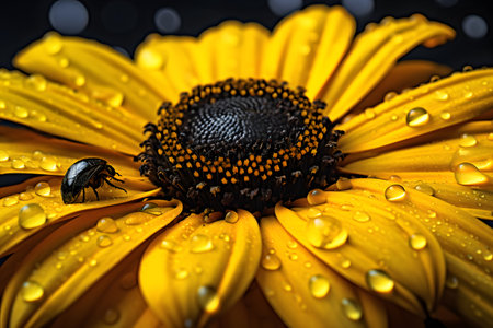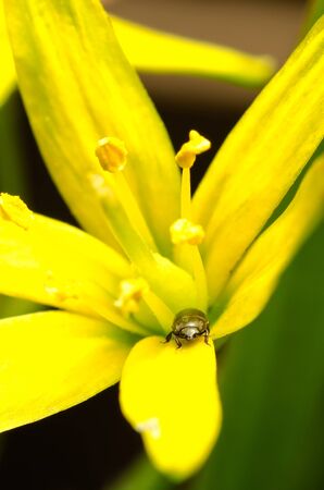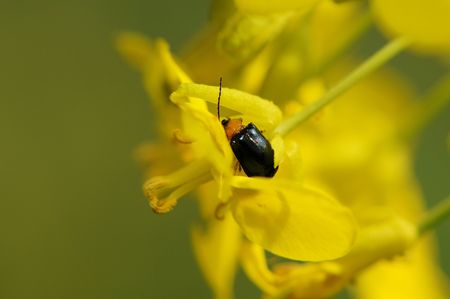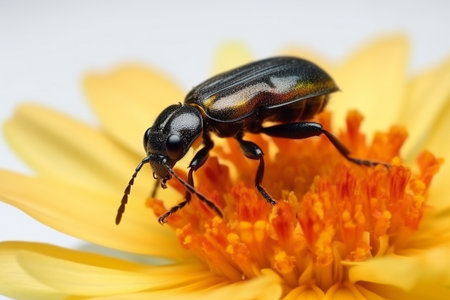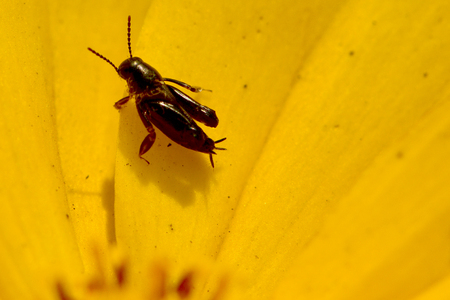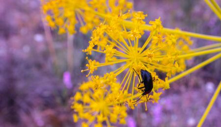 Black beetle on a yellow flower. Close-up. Selective focus.