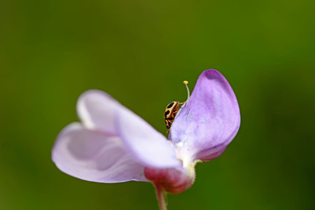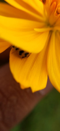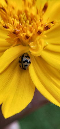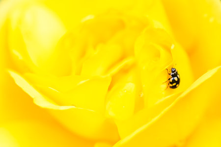Lady bug on the petal of yellow flower. Lady bug also known as lady bird beetle is useful in agriculture due to its feeding habit of aphids and many other insect pest of agriculture. Selective focus.