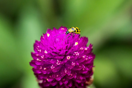 A closeup of a psyllobora vigintiduopunctata on gomphrena globosa in a field with a blurry background