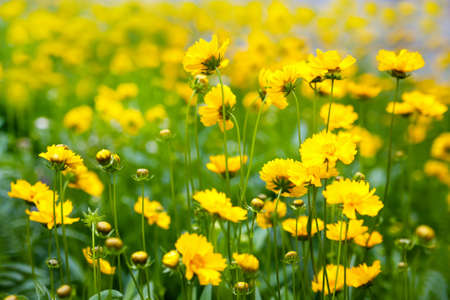 Yellow chrysanthemum flowers blooming in the field, soft focus