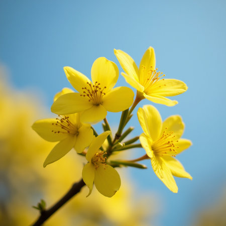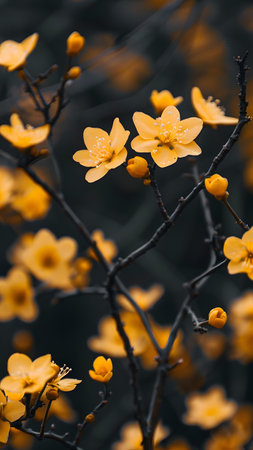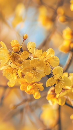 Vivid yellow flowers in full bloom on a branch, showcasing their delicate petals and vibrant spring beauty