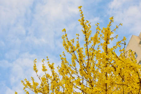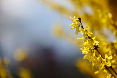 Yellow flowers of Forsythia blooming in spring on blue sky background