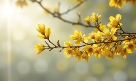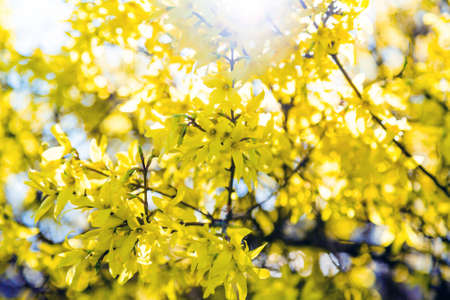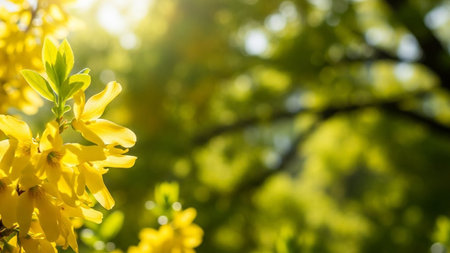 Bokeh showing bright yellow forsythia flowers blooming in spring sunlight with soft green bokeh background and lens...