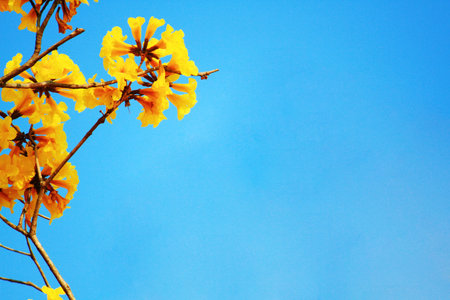 Flower detail on yellow ipe tree in early bloom with bright blue sky in the background