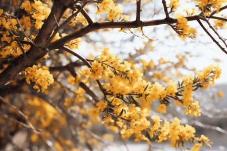 blooming yellow flowers on the branches of a tree