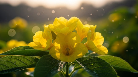 A close-up view of bright yellow flowers with green leaves, adorned with water droplets, bathed in soft sunlight...