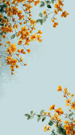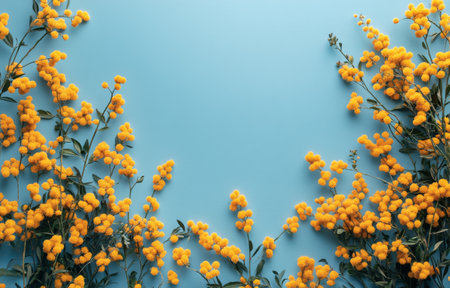 Yellow flowers create a lovely border on a soft blue background, enhancing artistic presentation in a creative setting filled with color and life.