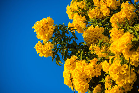 Bright yellow blossoms of Tecoma stans against a clear deep blue sky in full sunlight