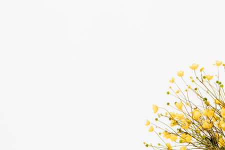 Yellow buttercup flowers on pastel background with petals. Nature concept. Top view. Flat lay