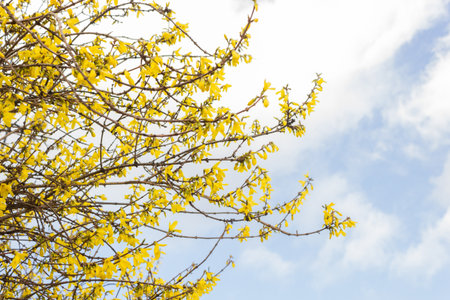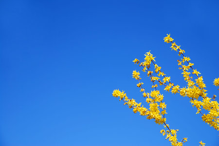 Yellow flowers of Forsythia blooming in spring on blue sky background