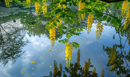 A picturesque mimosa tree flourishing with delicate yellow blossoms, its branches cascading with vibrant foliage and yellow flowers, evoking springtime freshness, banner