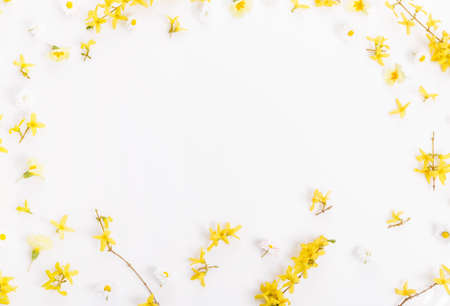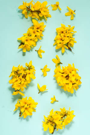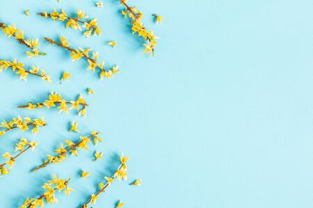 Flowers composition. Yellow flowers on blue background. Spring concept. Flat lay, top view