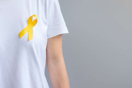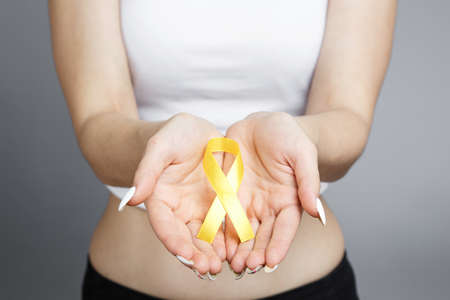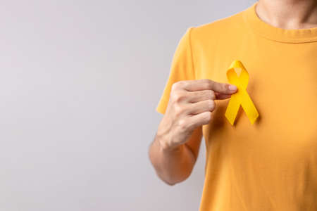 Young female holding yellow gold ribbon awareness symbol for endometriosis, suicide prevention, sarcoma bone cancer, bladder cancer, liver cancer and childhood cancer concept. Health care. Copy space.