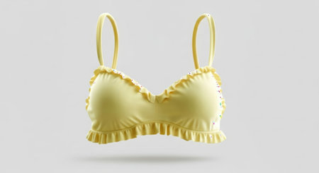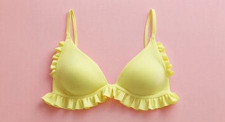 A light yellow bra with ruffled lace trim and thin straps is laid flat against a soft pink surface.