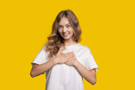 Caucasian woman with blonde hair wearing white t-shirt is smiling at camera on a yellow studio wall touching her heart with palms