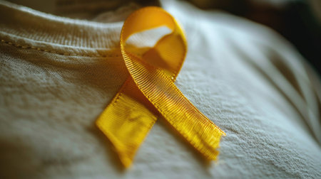 Detailed shot of yellow satin ribbon attached to females shirt, representing hope and solidarity with children battling cancer.