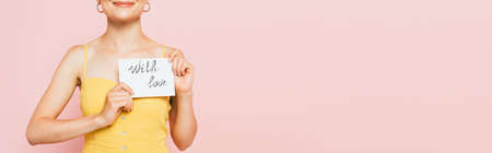 cropped view of young woman holding with love card isolated on pink, panoramic shot