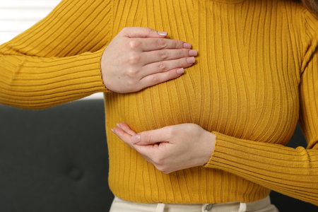 Mammology. Young woman doing breast self-examination at home, closeup